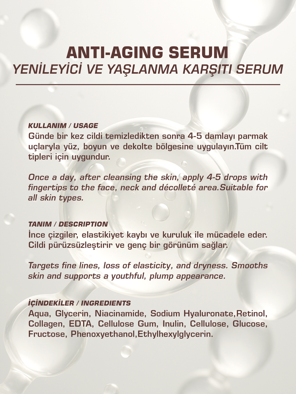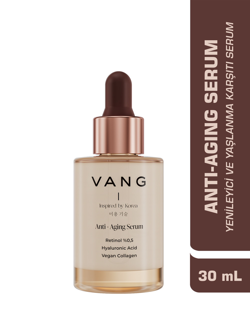 Vang Retinol Yaşlanma Karşıtı Serum, güçlü %0,5 Retinol, Hyaluronik Asit ve Vegan Kolajen formülüyle cildi derinlemesine yenileyerek kırışıklıkların ve ince çizgilerin görünümünü azaltır. Yaşlanma belirtilerine karşı etkili aktif içerikleriyle cildi besler, nemlendirir ve sıkılaştırır.