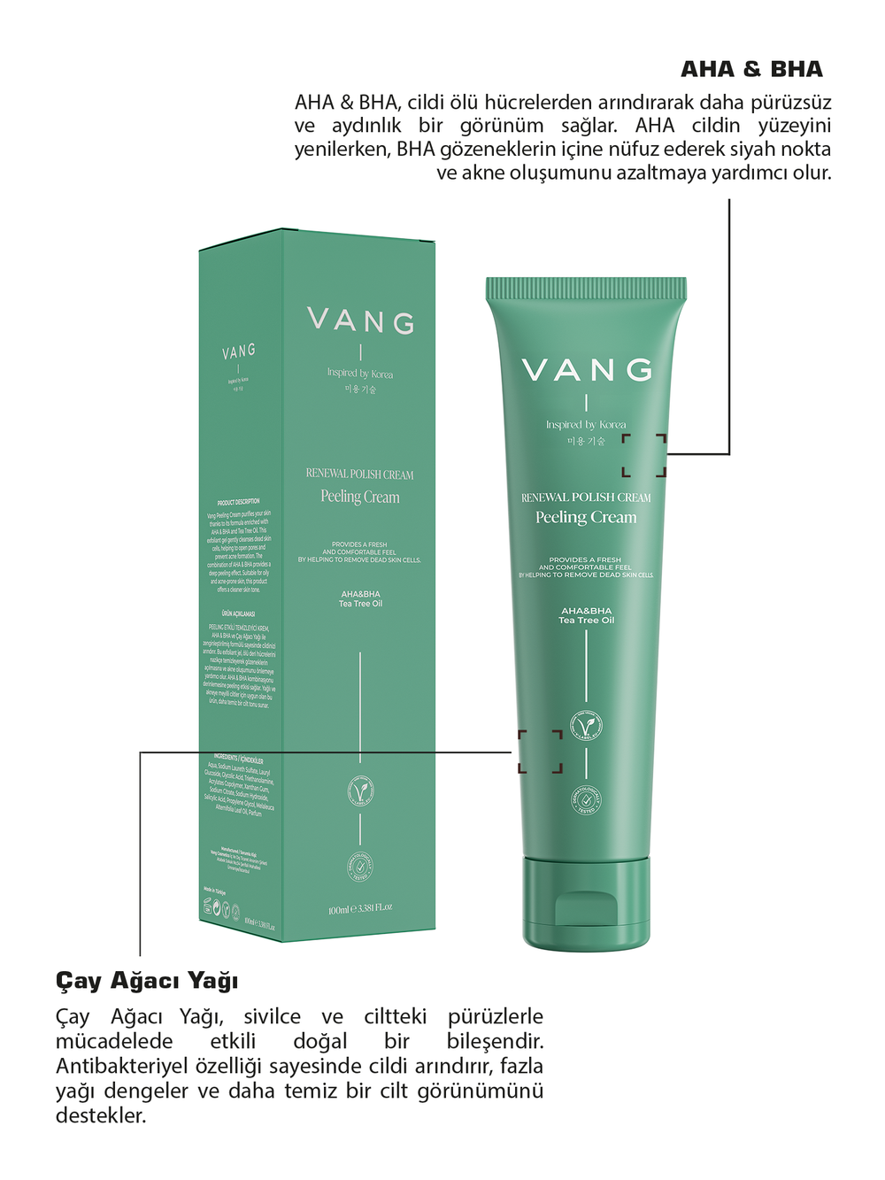 Vang Peeling Etkili Temizleyici Jel, AHA ve BHA içeriğiyle yağlı ve sivilceye eğilimli ciltler için özel formüle edilmiştir. Tea Tree Oil ile zenginleştirilmiş formülü, cildinize derinlemesine temizlik sağlar ve sivilce oluşumunu önlemeye yardımcı olur. Cildi nazikçe eksfoliye ederken, yağ dengesini düzenler ve pürüzsüz bir cilt görünümü sunar.