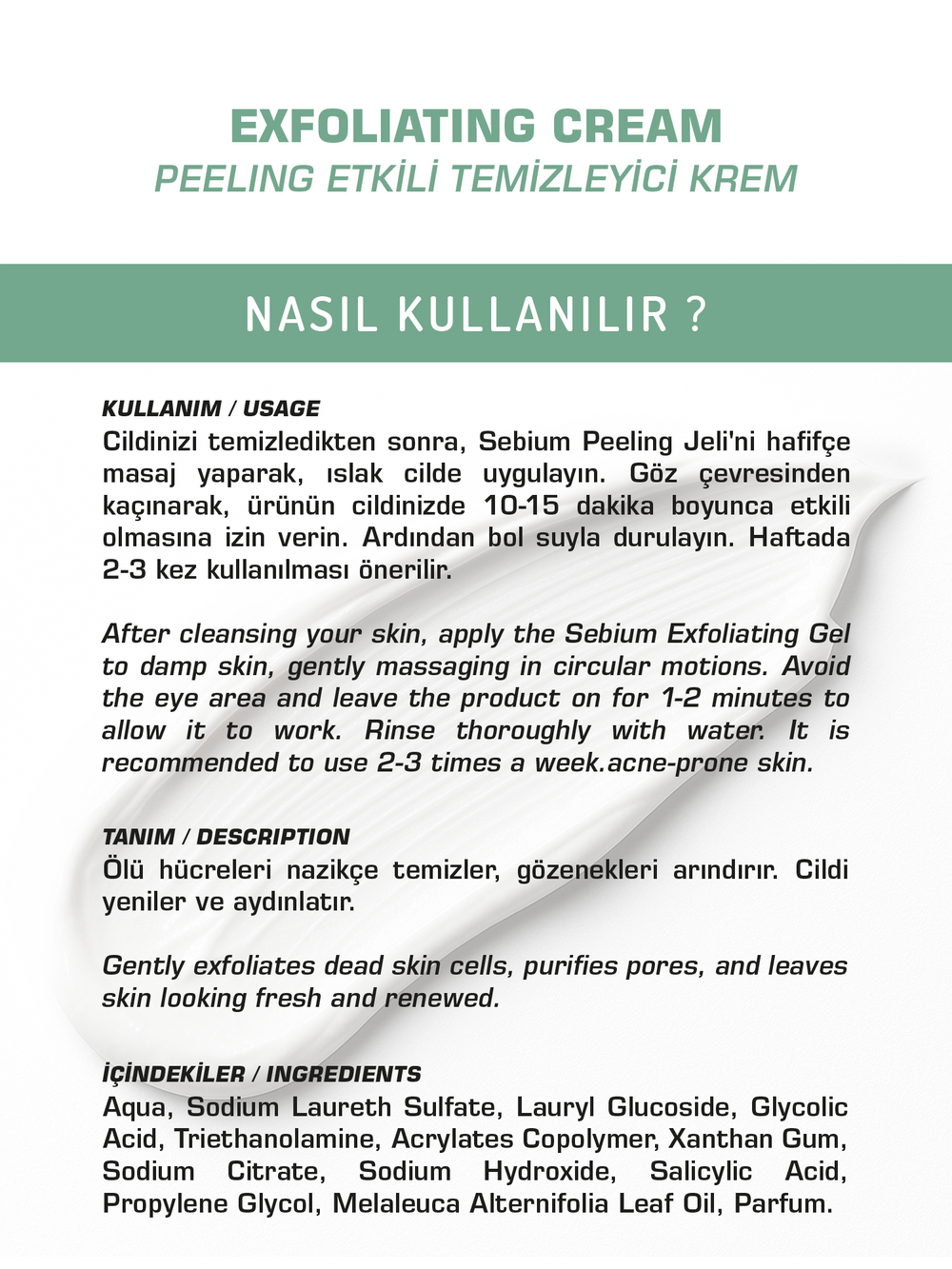 ✔ Peeling Etkisi – AHA ve BHA içerikleriyle cilt yüzeyindeki ölü hücreleri temizler ve taze bir görünüm kazandırır.
