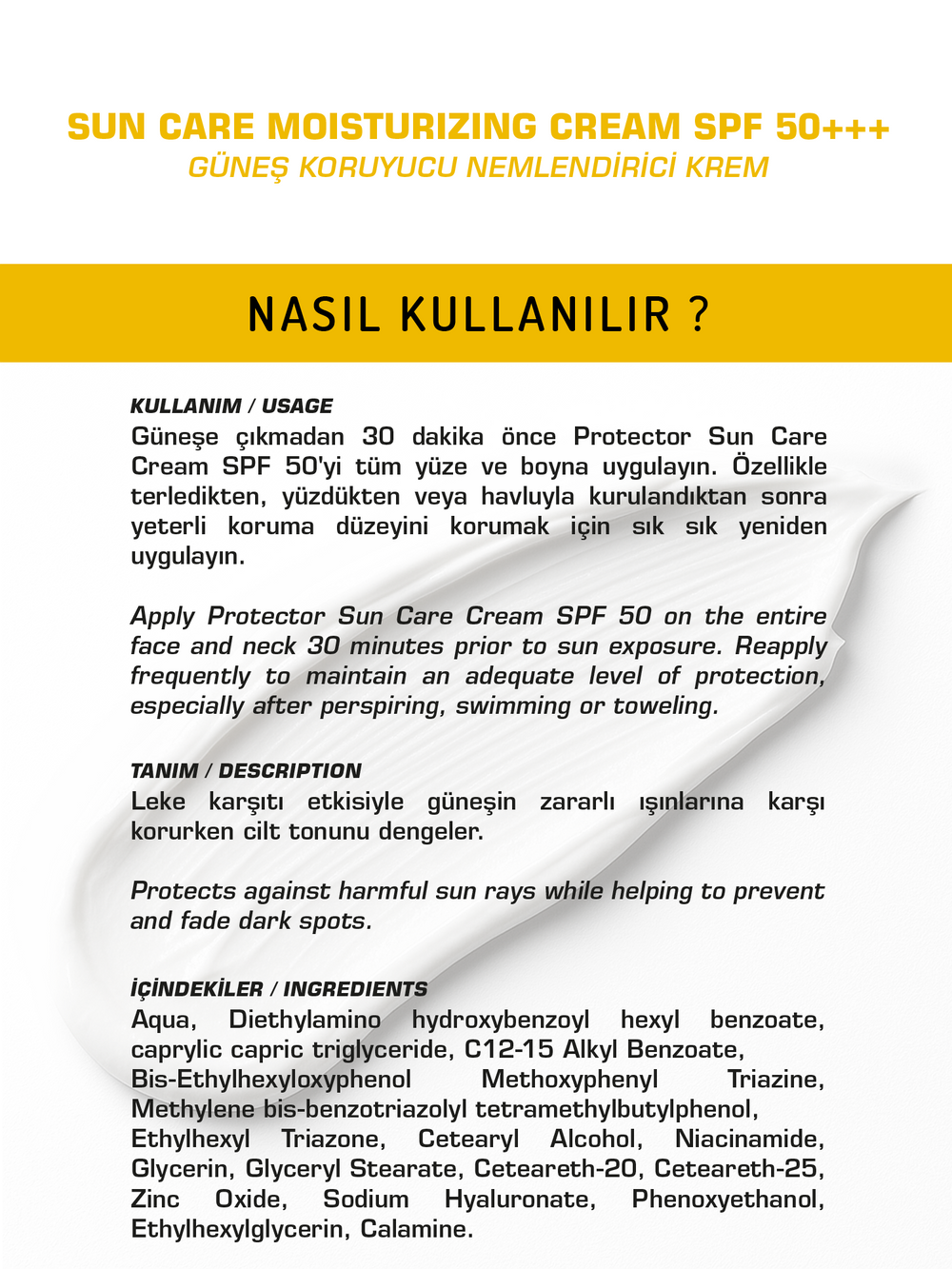 Güneşe çıkmadan 30 dakika önce Protector Sun Care Cream SPF 50'yi tüm yüze ve boyna uygulayın. Özellikle terledikten, yüzdükten veya havluyla kurulandıktan sonra yeterli koruma düzeyini korumak için sık sık yeniden uygulayın.